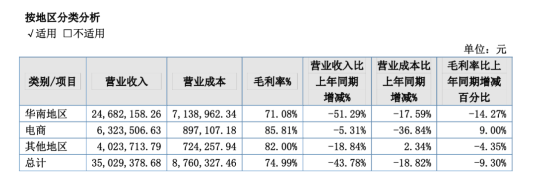 而从销售地区来看,2024年华南地区的销售占比超过了70%,电商及其他地区的销售占比依然很低。